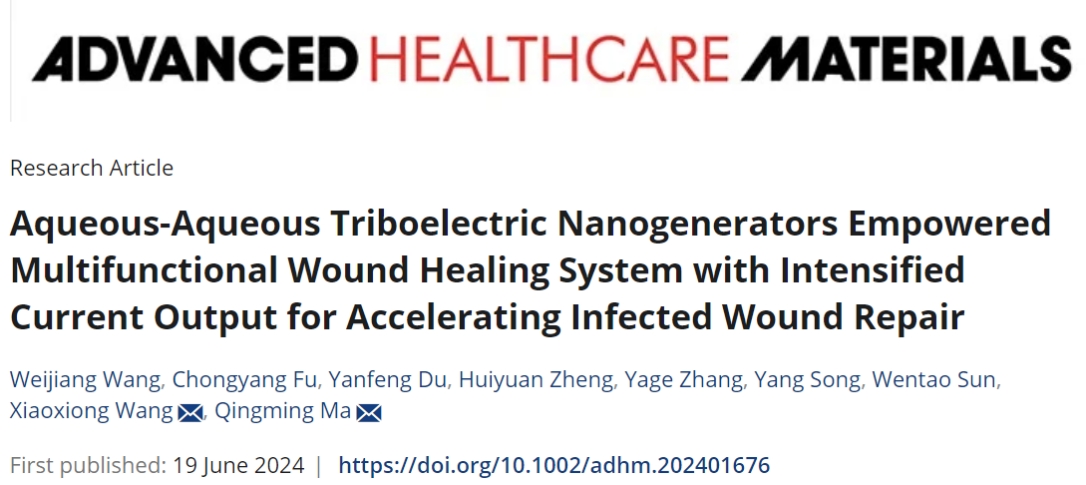 针对以上问题,公司马庆明教授团队联合物理公司王晓雄教授团队基于双水相体系的液-液相分离原理,构建了新型水-水摩擦电纳米发电机(A-A TENG)。凭借其独特的水相摩擦层材料物理性质,保证了高效、完全的接触与分离过程,显著提升了输出电流密度。在此基础上,利用A-A TENG的高电信号输出作为治疗性电刺激,开发了新型多功能伤口愈合体系:A-A TENG产生的电信号通过导线传输至贴附在伤口上的导电水凝胶,确保电场的均匀性和稳定性;增强的电流输出不仅可以直接调节细胞迁移行为,还可以增强抗菌作用,从而在创伤愈合的多个阶段发挥重要作用,全流程加速创伤愈合。A-A TENG展现了一种新型TENG的全貌,其超高的电流输出密度、独特的接触分离方式以及摩擦层的生物安全性不仅为创伤愈合提供了新的选择,而且预示着其在多个生命科学领域的潜在重要作用。该项工作以“Aqueous-Aqueous Triboelectric Nanogenerators Empowered Multifunctional Wound Healing System with Intensified Current Output for Accelerating Infected Wound Repair” 为题发表在国际权威学术期刊《Advanced Healthcare Materials》(1区TOP,IF=11.092)。公司马庆明教授、物理公司王晓雄教授为论文通讯作者,365英国上市公司2022级硕士研究生王伟江为该论文的第一作者。研究工作得到了国家自然科学基金、山东省泰山学者青年专家人才计划、山东省高等公司青创科技计划创新团队发展计划等项目资助。