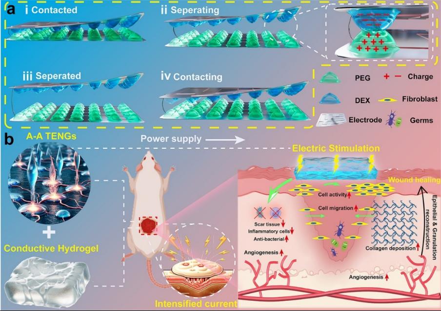 传统的创伤口治疗策略,如抗生素使用、各种药膏、手术缝合以及水凝胶敷料等,虽广泛应用于连接受损组织并加速伤口愈合,但诸如抗生素滥用等越来越多的问题正逐渐显现。此外,常规的电刺激治疗创伤虽然有效,但其所需的设备通常体积庞大,使用不便,且维护成本高昂,这些问题限制了其实际应用的范围和效果。在当前的技术环境下,摩擦电纳米发电机(TENG)不仅发挥了电刺激治疗创伤愈合的独特优势,还克服了传统电源的携带不便和使用复杂的问题。然而,常规TENG的固有缺点在于两摩擦层材料在接触时在介观层面上存在不平整,而在微观层面上存在进一步的起伏,导致两摩擦层无法实现完全的有效接触。这种不完全接触限制了材料间的电子交换,进而影响了电流密度等电能输出,制约了其在生物医药等关键应用的潜力。
