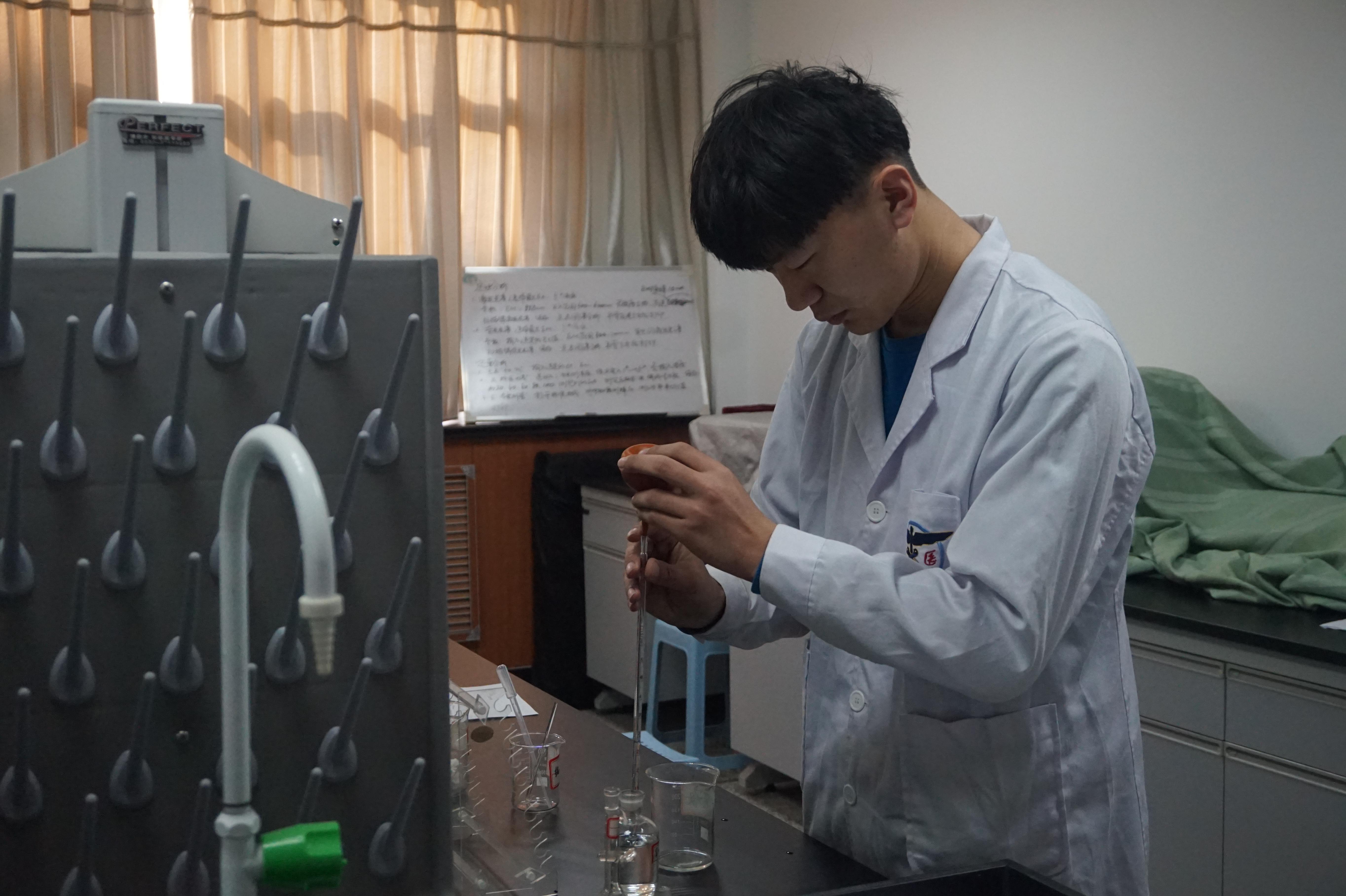 复赛形式为实验操作,考察员工药理实验、药物化学实验和仪器分析实验的实操技能。药理实验是小鼠的腹腔注射,家兔的耳缘静脉注射和灌胃;药物化学实验为酸碱滴定法计算氢氧化钠溶液中氢氧化钠的含量;仪器分析实验为紫外分光光度法测定异烟肼水溶液中的异烟肼含量实验。指导老师根据同学们现场的实验操作表现进行打分。