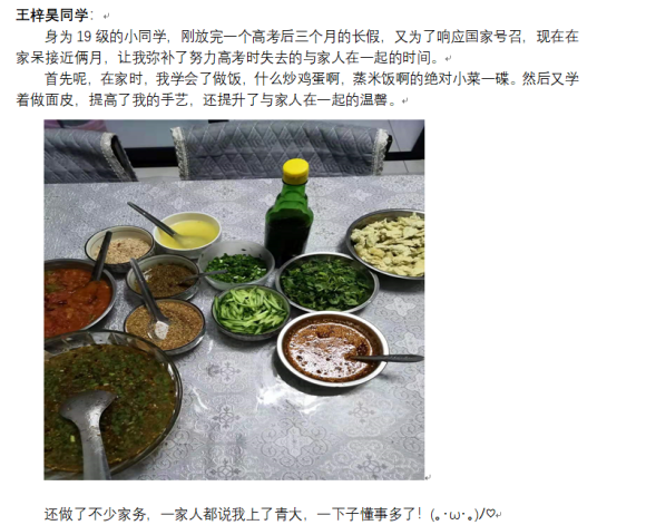 各班认真谋划,精心组织。各班班主任和班委同学带领同学们认真学习疫情防控知识并在网上开展学习讨论,,有的班级集体观看了“最美逆行人”的视频,有的班级同学分享了志愿者的所思所为,有的班级对网络谣言进行了分析和讨论,有的班级组织同学们分享了在家网上学习经验,推荐了阅读书目,分享了读书心得,作出了新学期安排和规划,有的班级组织同学们分享了个人居家运动计划,分享了防疫大扫除、种植花草、厨艺美食、手工编织等成果。