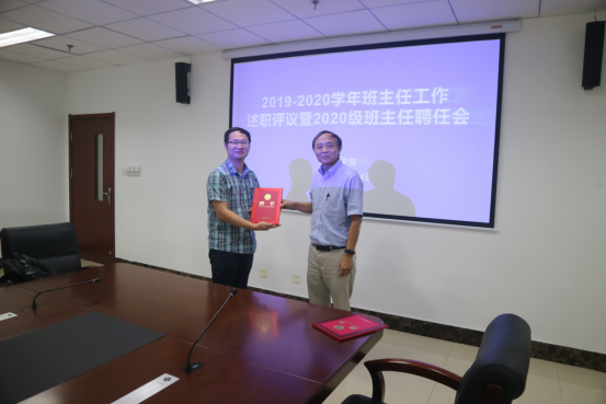 会议首先进行2019-2020学年班主任工作述职评议。12位班主任以PPT形式图文并茂汇报了工作思路、工作举措和工作成效,分析了工作中存在的问题,提出了新学年工作思路和打算。汇报人现场回答了与会领导提出的问题。会议进行了现场评议打分。随后,经理王克威为2020级班主任卢炜、王惠老师颁发聘书。