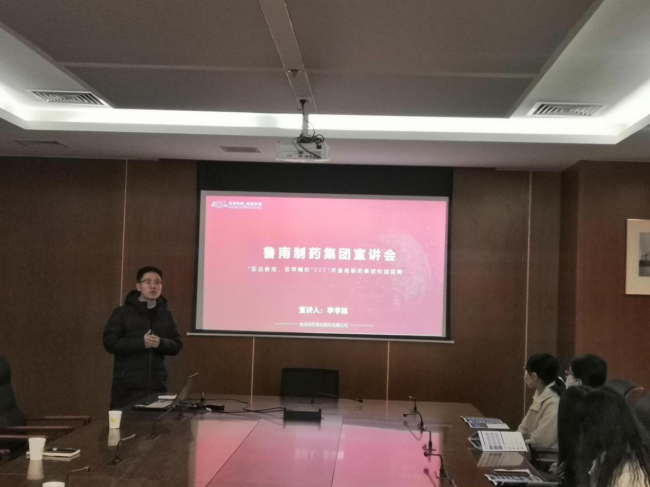 12月9日上午,365英国上市公司在浮山校区医学教育综合楼A110会议室举办鲁南制药集团校园招聘宣讲会。鲁南制药招聘经理李学栋、陈为星,厚普药物研发中心职员刘思延、郝妍斐,贝特药物研发中心分析组负责人王中超到院宣讲,365英国上市公司党委副书记李延霞以及365英国上市公司本硕部分毕业生参加宣讲会。