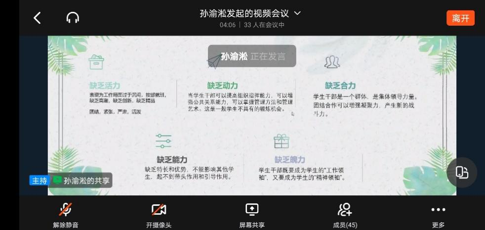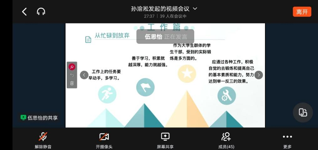 伍思怡随后发言,她从自身加入员工工作的初心开始,讲述了自己从大一浑浑噩噩到大二大三精神饱满、目标坚定的个人经历。告诉大家要做好个人规划与权衡利弊,合理安排学习、科研、员工工作三者间的关系,培养出独立思考的批判性思维能力。对于员工工作,伍思怡又着重强调多交流与换位思考的能力,将自身放在老师与同学们的立场之上,要做到相互尊重。而后伍思怡又号召大家培养主动学习的能力,无论是在工作还是生活之中都要早早去准备,做到有备无患。最后伍思怡引用“路漫漫其修远兮,吾将上下而求索”为结,期待与同学们高处相见。