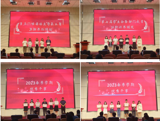 随后,员工会全体成员上台领取任职证书。主持人宣布本学期员工会优秀副部及优秀干事名单并进行颁奖。共有12位同学获得“优秀副部”称号、22位同学获得“优秀干事”称号,员工会主席团成员分别为获奖者颁发荣誉证书并合影留念。