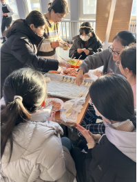 岁寒隆冬至,煮饺话团圆,师生欢聚一堂。餐厅工作人员准备好食材和工具后,同学们开始了精彩的包饺子过程。大家分工明确,擀、剁、捻、捏,一系列动作行云流水,灵活的手指捏出漂亮的花纹,形态各异、造型可爱的饺子陆续出现在面板上。同学们欢声笑语,不时分享着包饺子的技巧和心得,交流生活趣事,场面温馨而祥和,充满着“家”的味道和温暖。