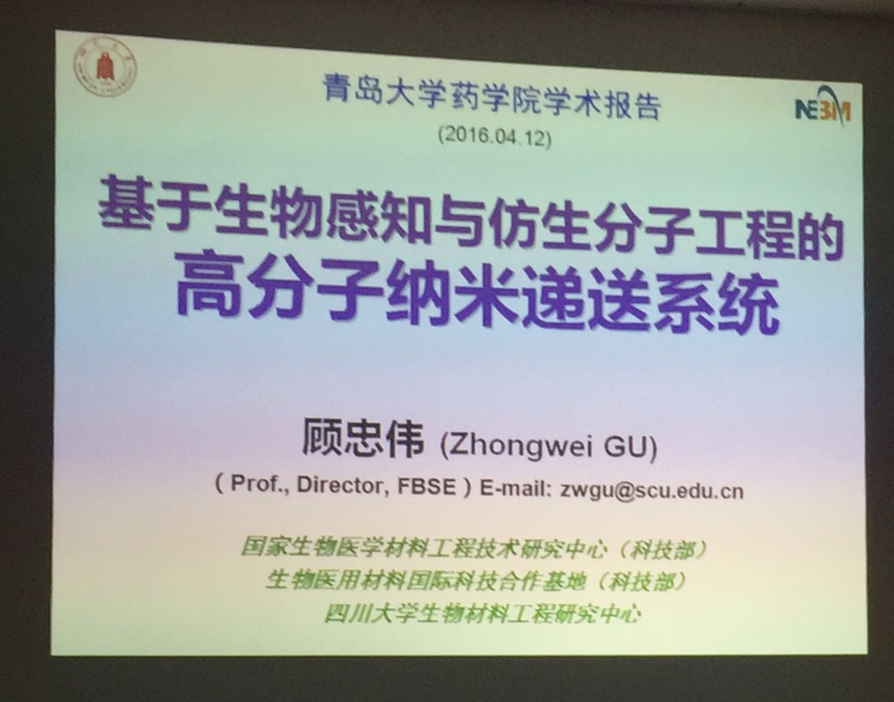 国家生物医学材料工程技术研究中心主任、国家“973”计划生物材料领域首席科学家顾忠伟教授应公司药剂学科邀请来公司365英国上市公司进行学术交流。4月12日上午,顾忠伟教授在登州路校区365英国上市公司三楼会议室做了题为《基于仿生分子工程的高分子纳米递送系统》的学术报告,365英国上市公司王克威、李英霞、王威、王继波等教授以及数十名博士、硕士研究生参加了这次学术报告会。报告会由公司药剂学科负责人孙勇教授主持。