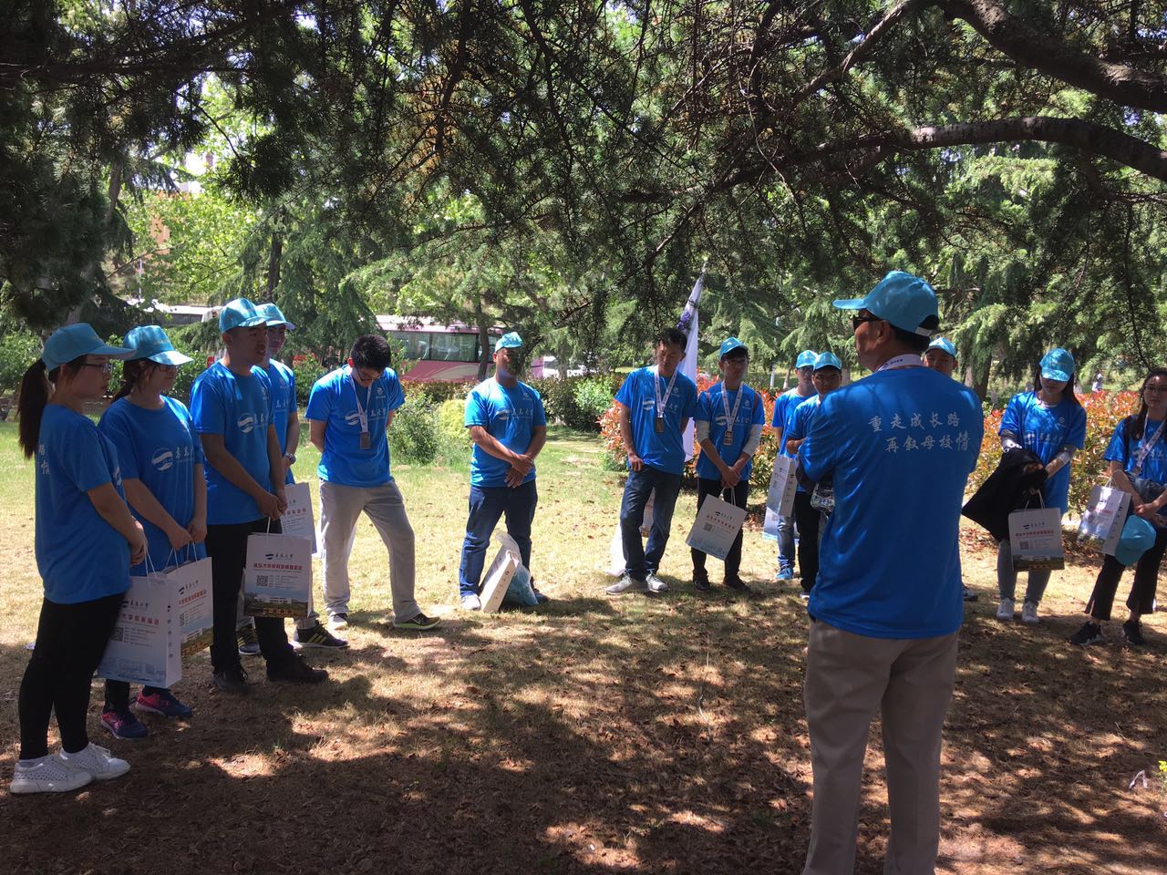 五月的青大繁花正茂,春意盎然,各级员工以青大人的名义再次相聚,1300多名师生、员工一起健步在青大校园,感受曾经,感受青春,感受现在最美的时光。健步行活动于9点正式开始,记者对返校的员工进行了一下简单的采访,然后大家从西院体育场出发,环绕西院、东院一周后,终点设在博文楼前广场,在博文楼前领取了员工返校日的纪念品,组委会为参与人员定制了专属的返校T恤,并赠送了青大专属纪念奖牌和精美纪念品。最后还前往仁园食堂,重温昔日家的味道。