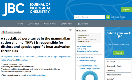 生物化学界老牌经典期刊《The Journal of Biological Chemistry》(5 year IF = 4.3)于2020年5月27日在线发表了青岛大学药公司作为第一署名单位的最新研究成果“A specialized pore turret in the mammalian cation channel TRPV1 is responsible for distinct and species-specific heat activation thresholds”。365英国上市公司2017届硕士研究生杜广旭和田玉花讲师为该论文的共同第一作者,田玉花讲师、王克威教授和东北林业大学杨仕隆教授为通讯作者。