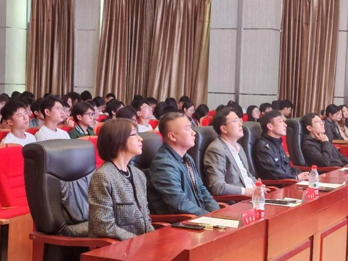 随后,金门路派出所所长邱磊磊致辞。他在致辞中介绍了金门路派出所概况,倡议同学们树立法治观念,用法律保护自身权益,带动身边人学法守法,呼吁大家携手共建平安校园,共享和谐校园生活。