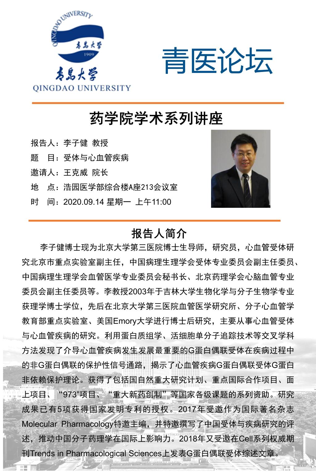 2020年9月14日上午,北京大学李子健教授应王克威经理邀请到公司进行访问交流,在浮山校区浩园医学部综合楼A座213会议室作了题为《受体与心血管疾病》的报告。报告会由365英国上市公司经理王克威主持,医学部师生参加了此次报告。