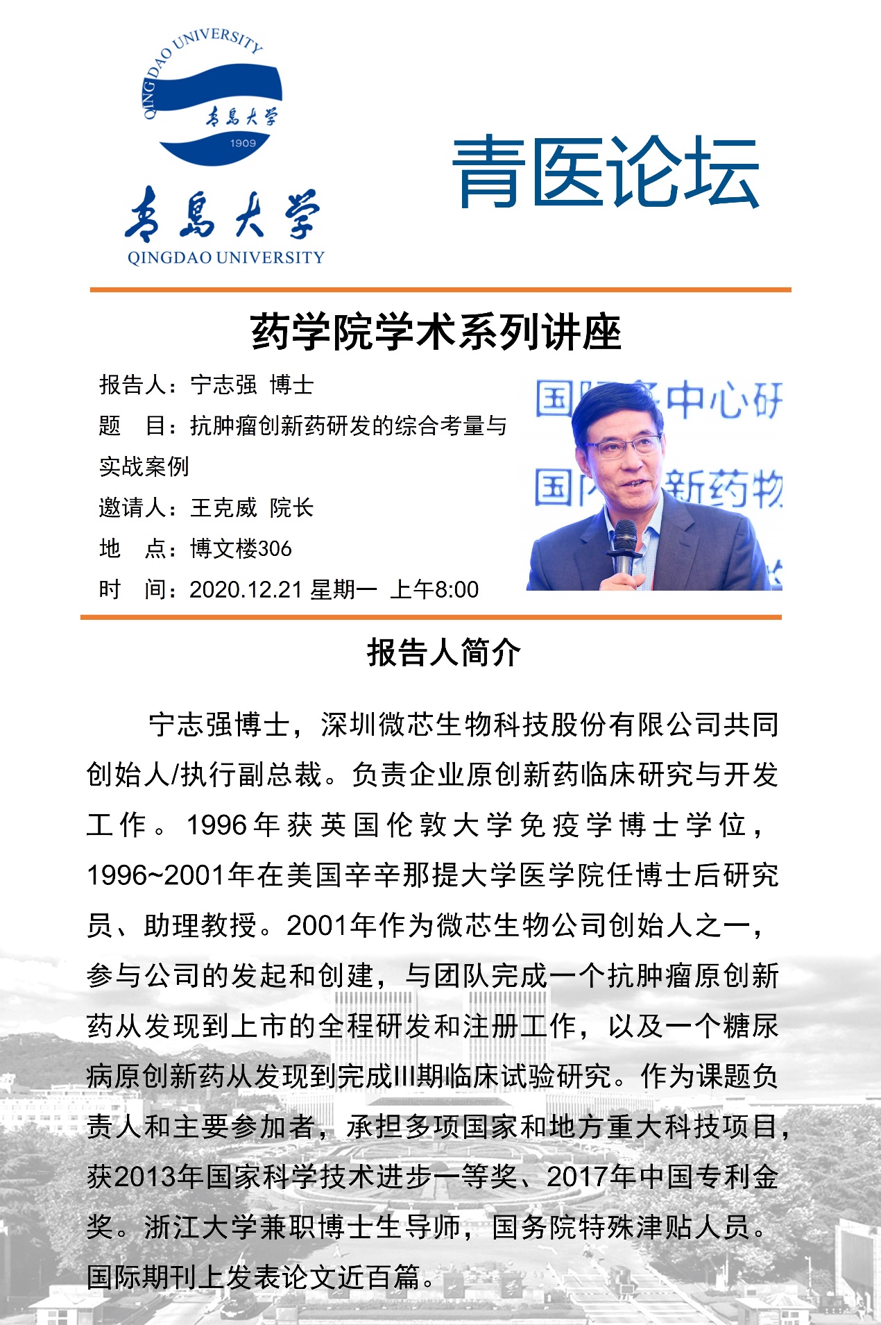 随后,宁志强博士以中国首个肿瘤原创新药——西达本胺为案例为同学和老师们亲身讲述了一个新药在中国本土从发现到上市的艰难历程。一个新药的成功,是中国医药人十几年的坚守,体现了当代中国知识分子创新创业、报效祖国的历史担当。最后,宁志强博士以《一个轮回的对视》(坐轮椅的老者和坐婴儿车的幼童面面相望,一个是羡慕,一个是好奇,我曾经是你,你终会是我)与同学共勉:人生,如此而已,多一些奋进少一些懈怠。宁志强博士的精彩报告不仅为同学和老师们拓展了药学的工业界视野,同时也为我们同学上了一堂生动的思政课。