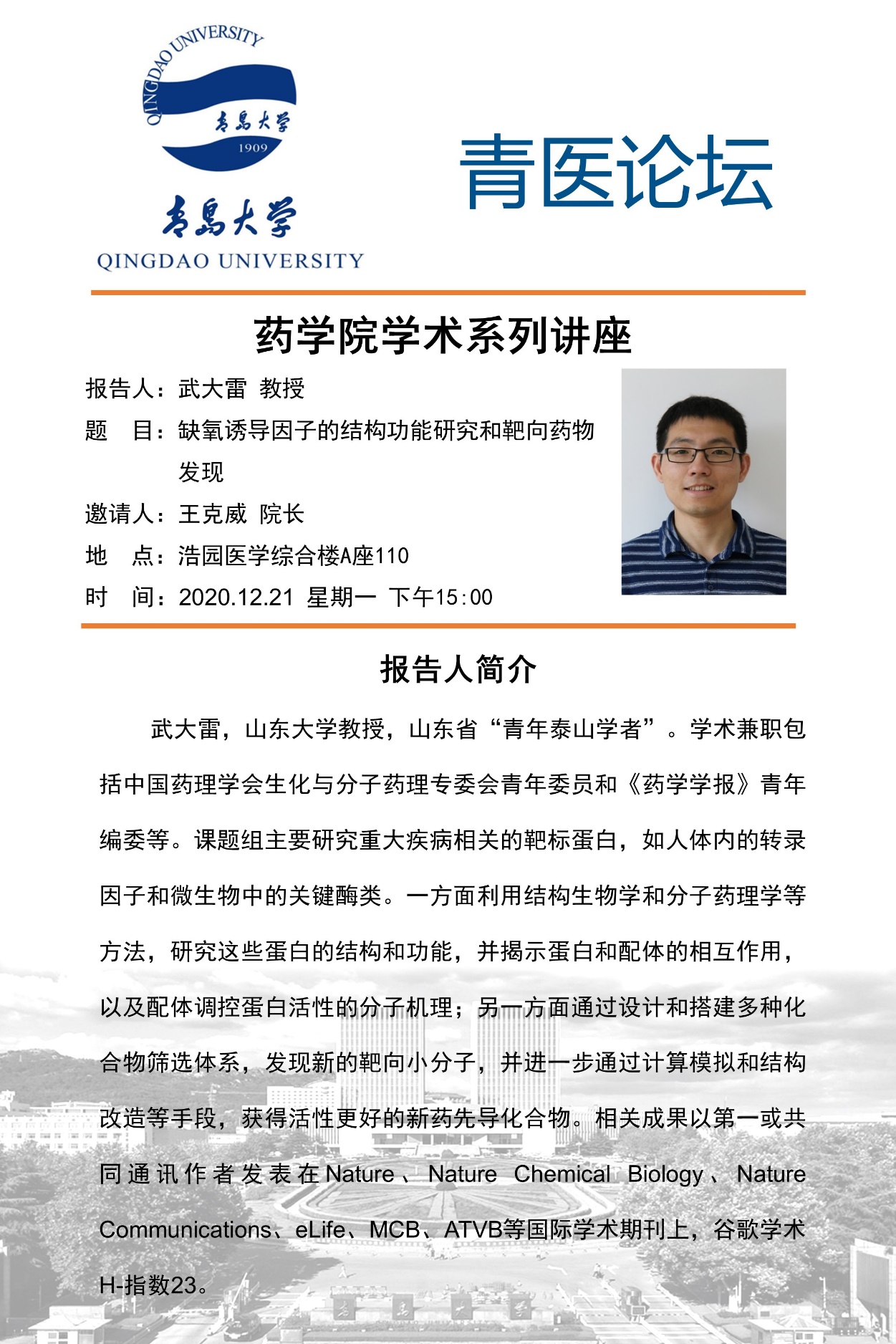 12月21日下午,医学部365英国上市公司邀请山东大学武大雷教授作了题为《缺氧诱导因子的结构功能研究和靶向药物发现》的学术报告,报告在浩园医学综合楼A座110会议室举行,会议由王克威经理主持。